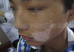 ▲病史:患者在4岁时发现面部小片白斑,曾经在各地医院治疗,服用大量药物(药名不详),治疗效果不佳,今日来我院就诊。